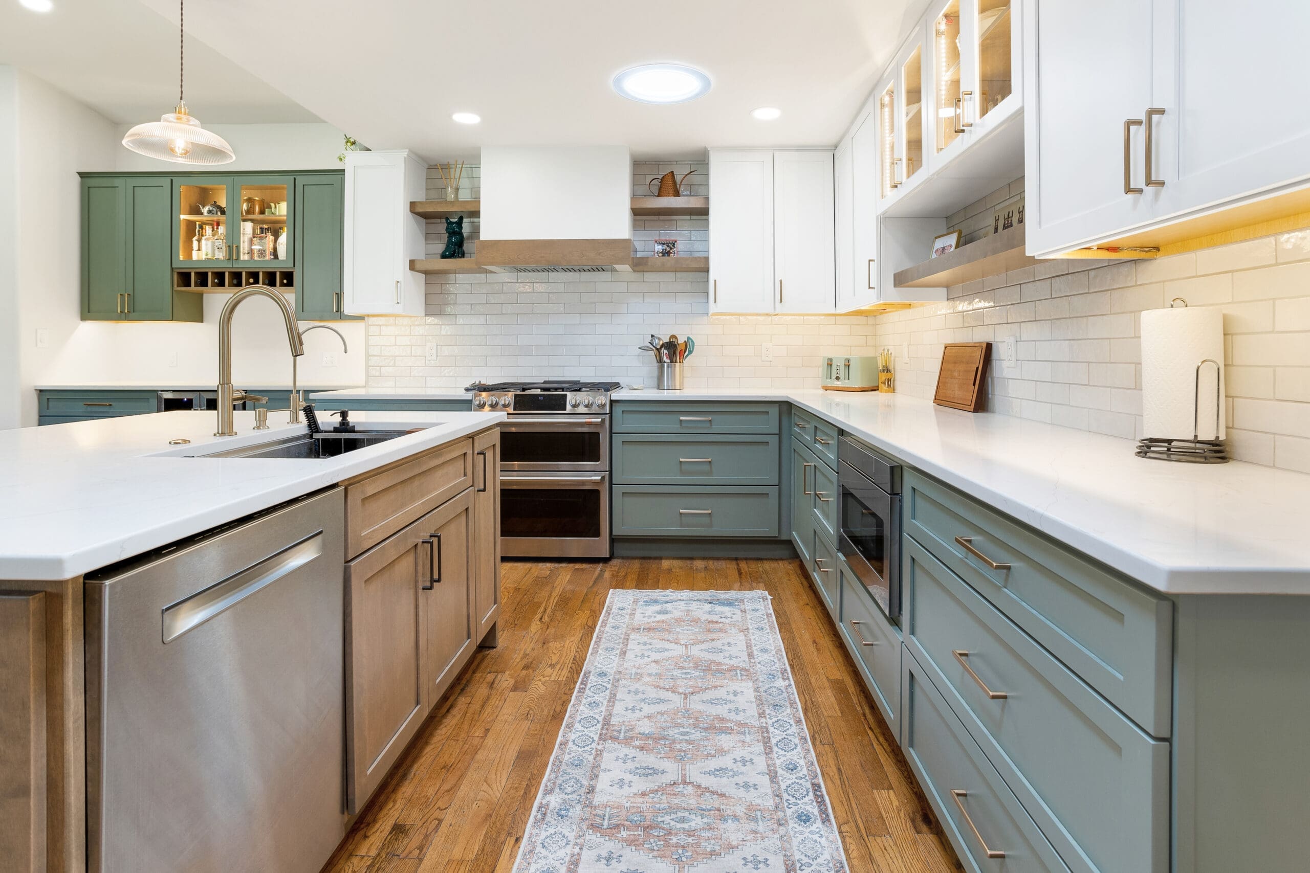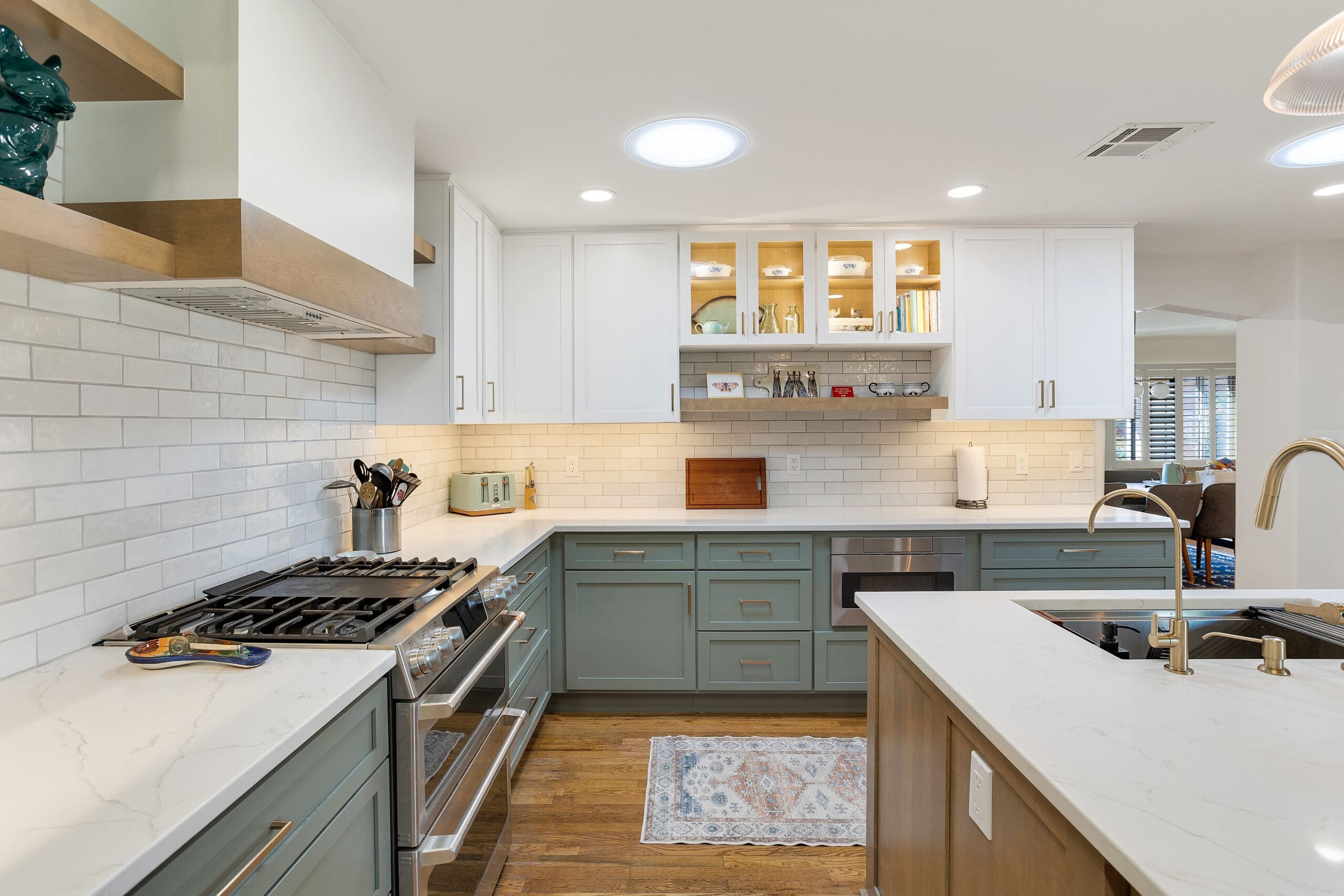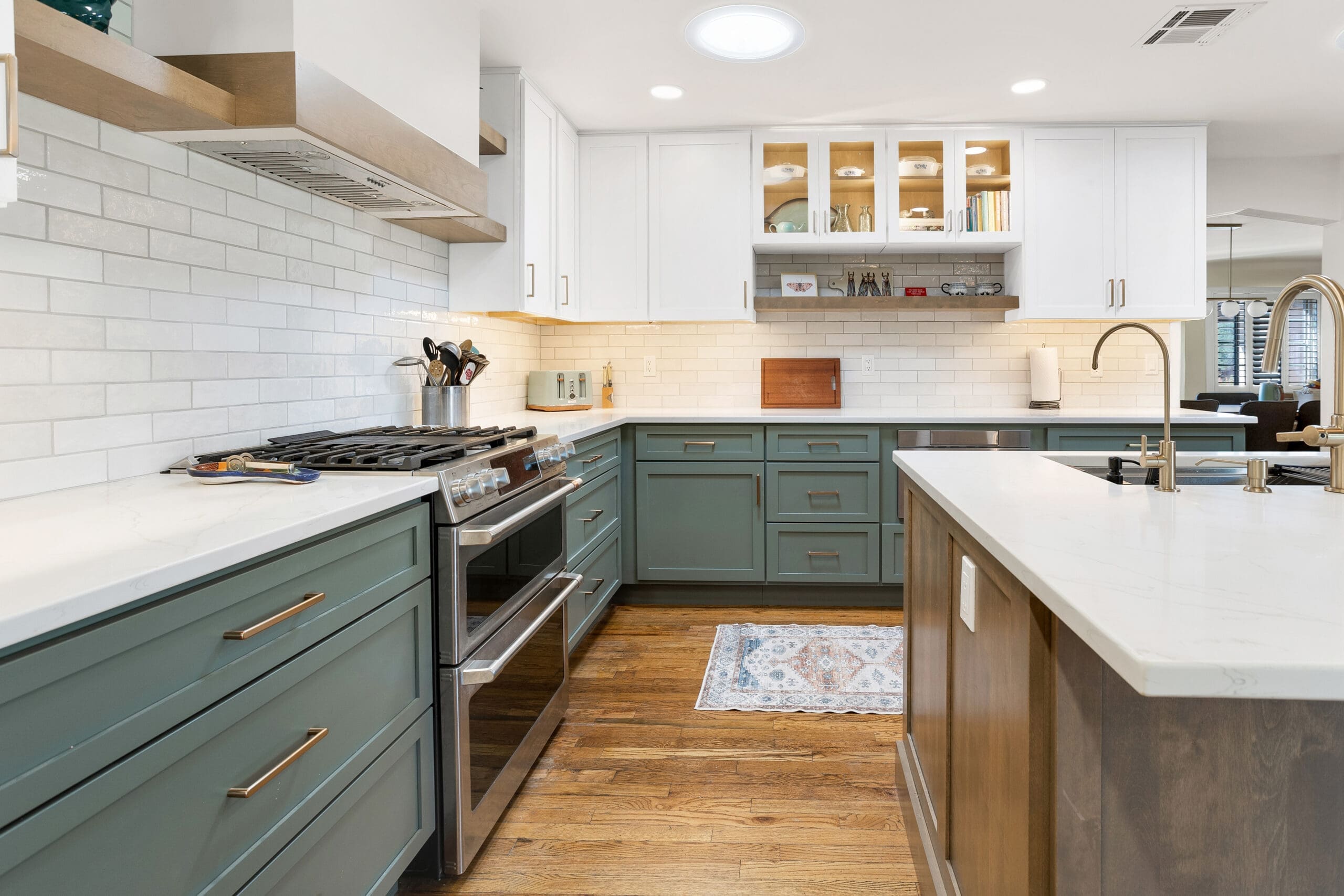 New appliances, including a range, microwave drawer, and custom hood, were installed to enhance the kitchen’s functionality. The three-color design works together in harmony, achieving the desired earth-tone look that complements the overall aesthetic.