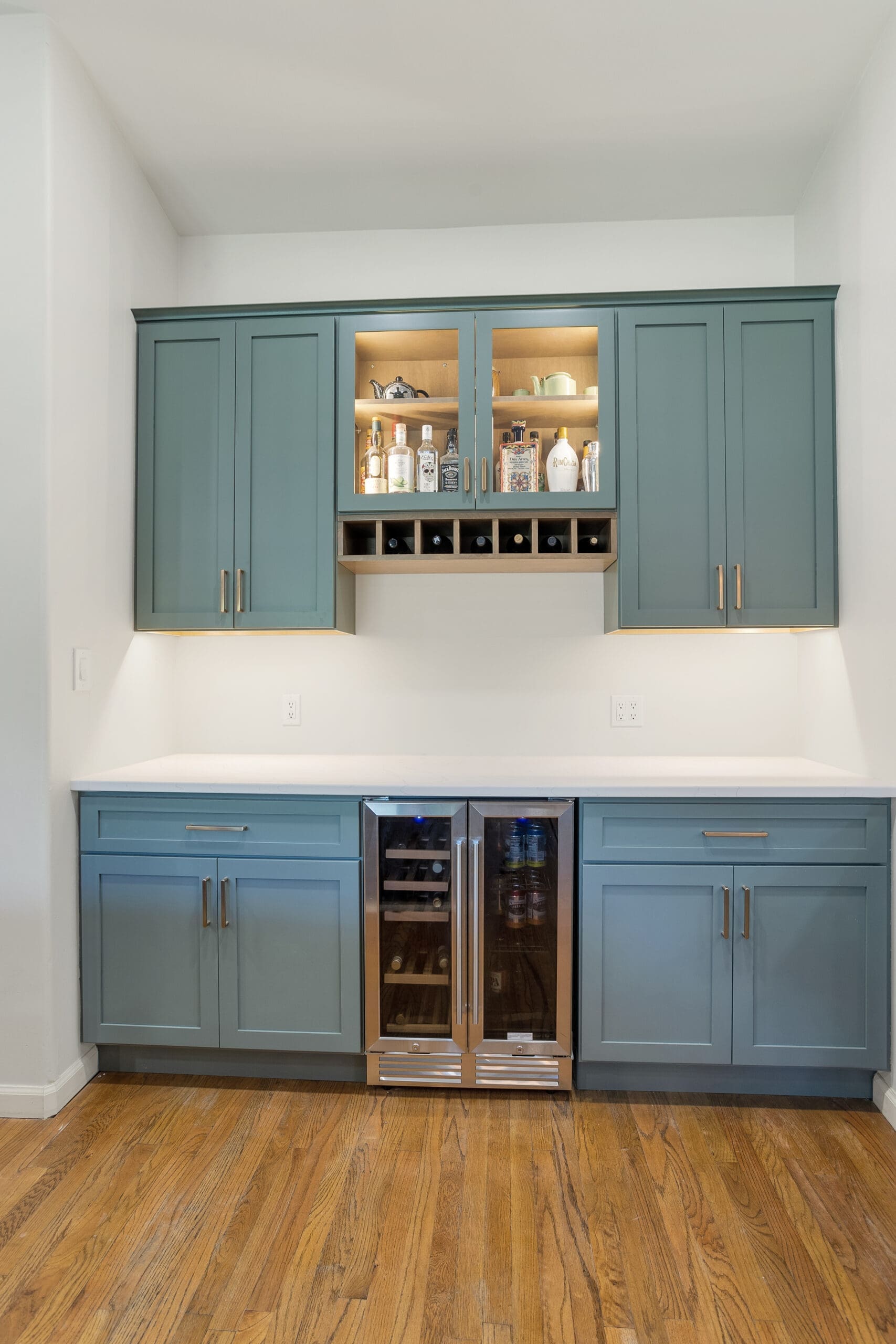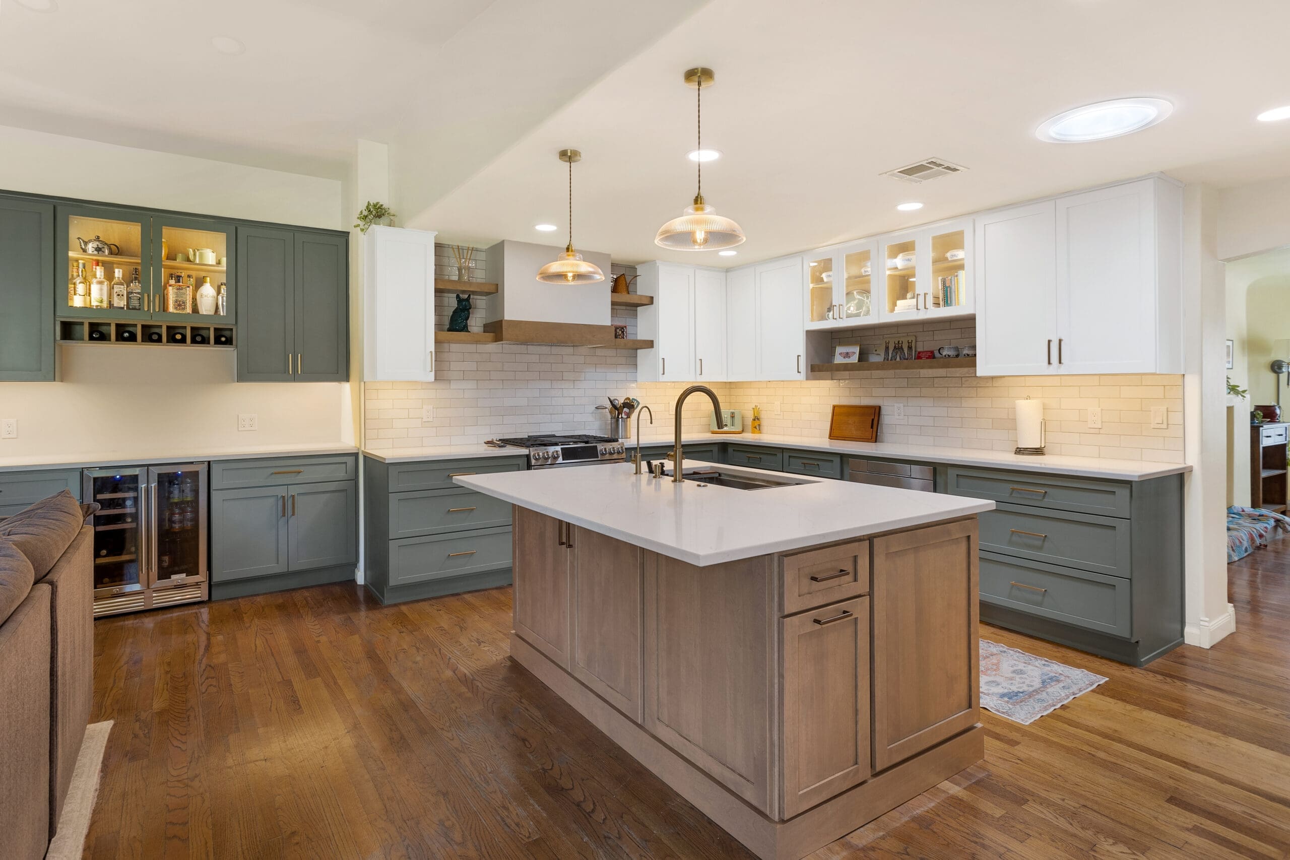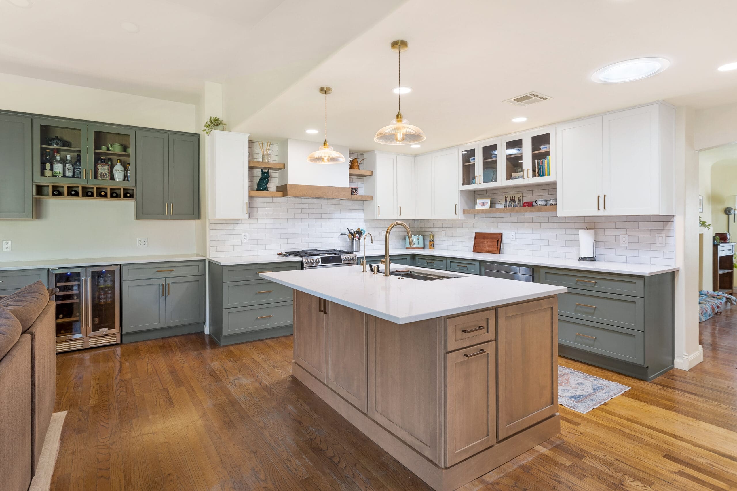 The remodel embraced an open concept with an island, utilizing the existing layout. Special features include custom trash pull-outs, a custom hood built on-site, floating shelves, and full-extension soft-close doors and drawers. Additional drawers were added, and the buffet was reworked into a beautiful beverage center.