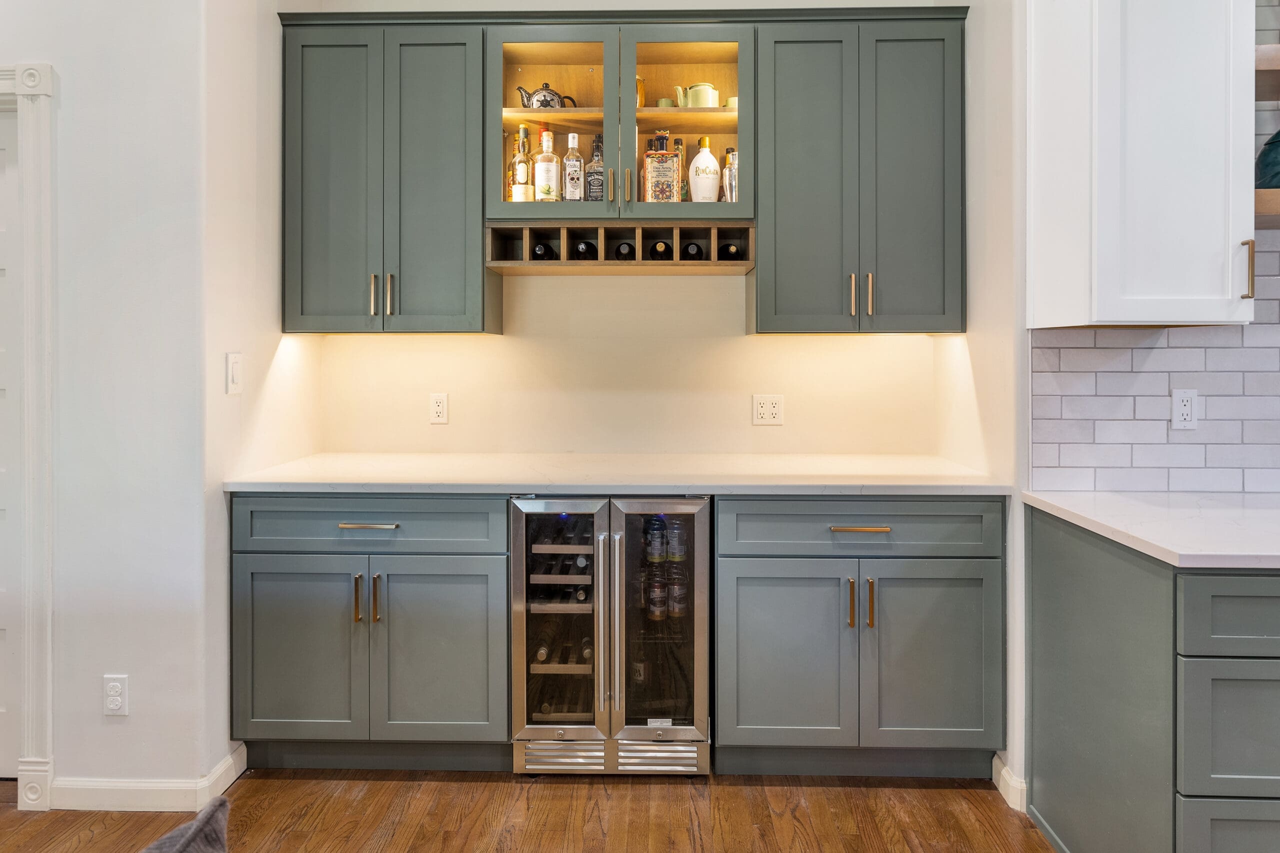 In this contemporary earth-toned kitchen remodel in Central Tucson, Arizona, a harmonious blend of soft, warm colors was used to create an inviting and functional space. The design features three colors: driftwood birch as an accent, painted white, and a custom Sherwin Williams 6207. The cabinets are a mix of birch and painted finishes, paired with engineered quartz countertops and porcelain subway tile backsplash. The existing wood flooring was retained to maintain continuity.