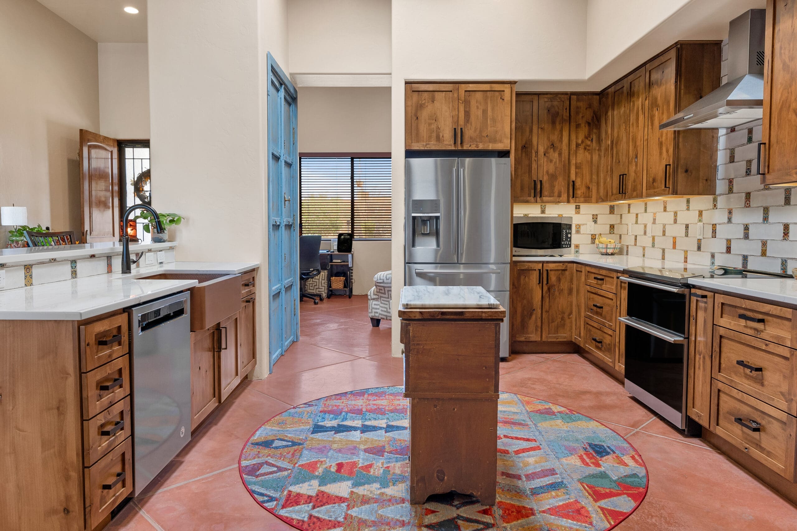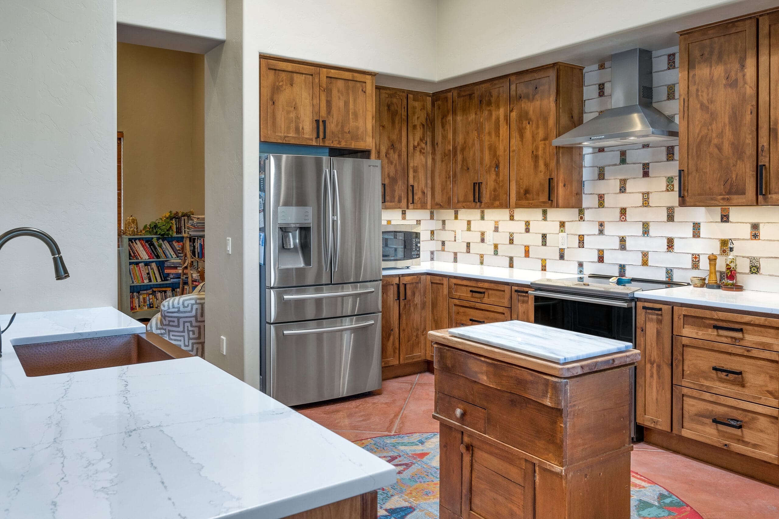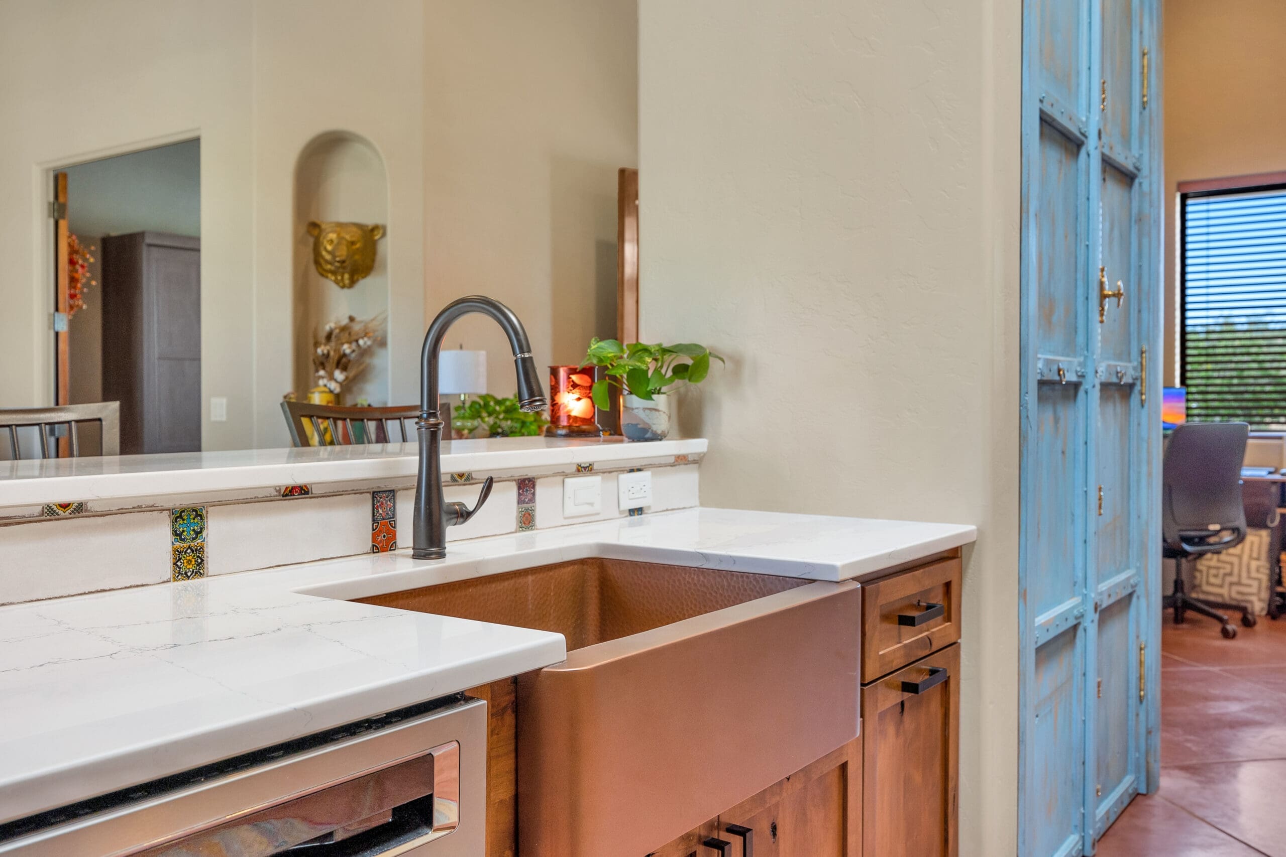 In this rustic antique kitchen remodel with a southwest vibe in Vail, Arizona, the space was transformed using rustic alder cabinets with a dawn stain, Della Terra Quartz countertops, and a Mexican-style tile backsplash. The concrete flooring adds to the rustic charm, creating a cohesive and inviting atmosphere.