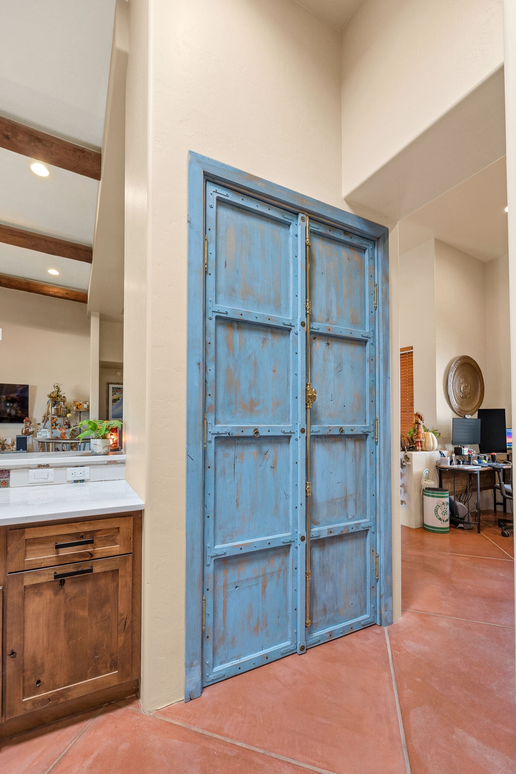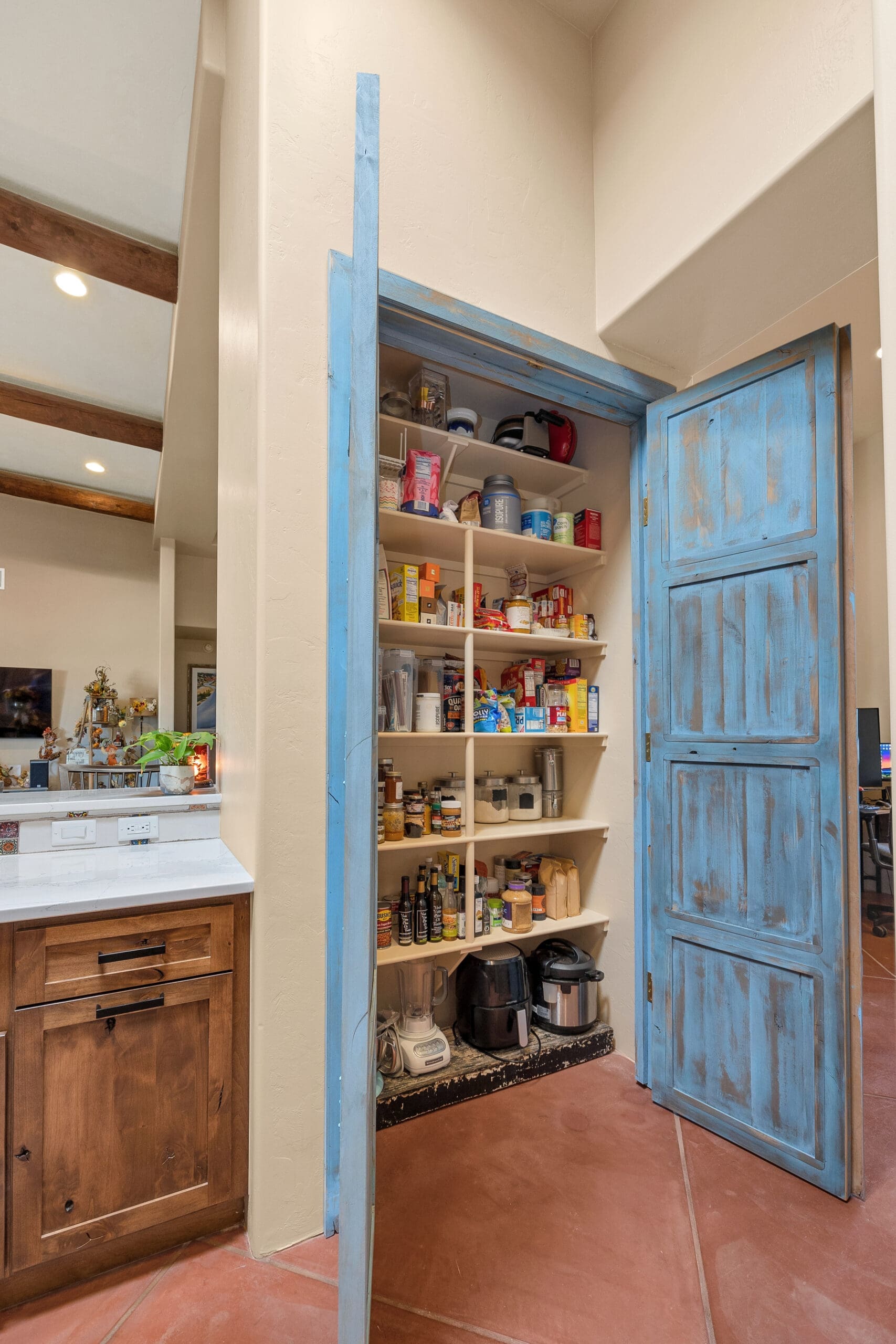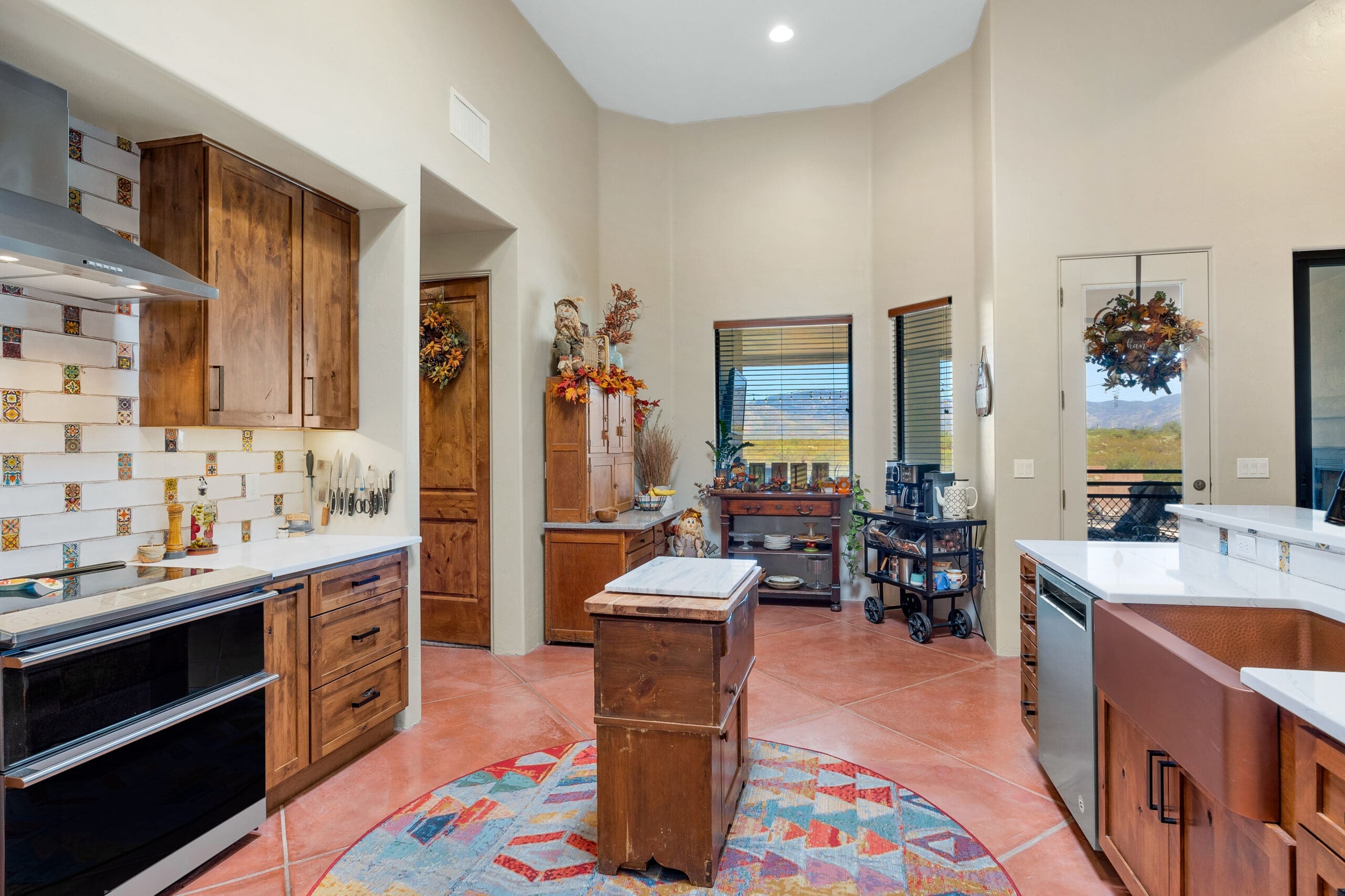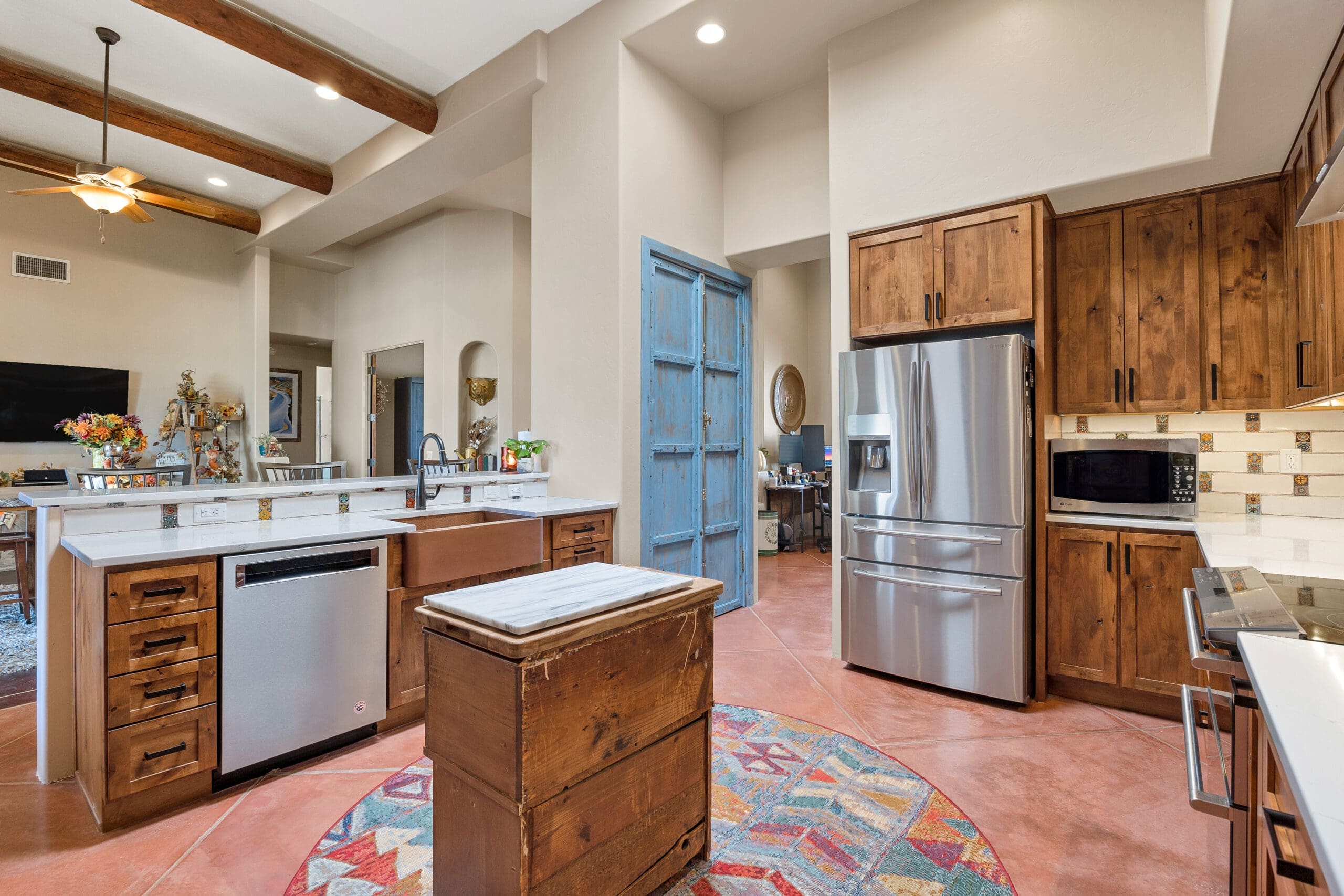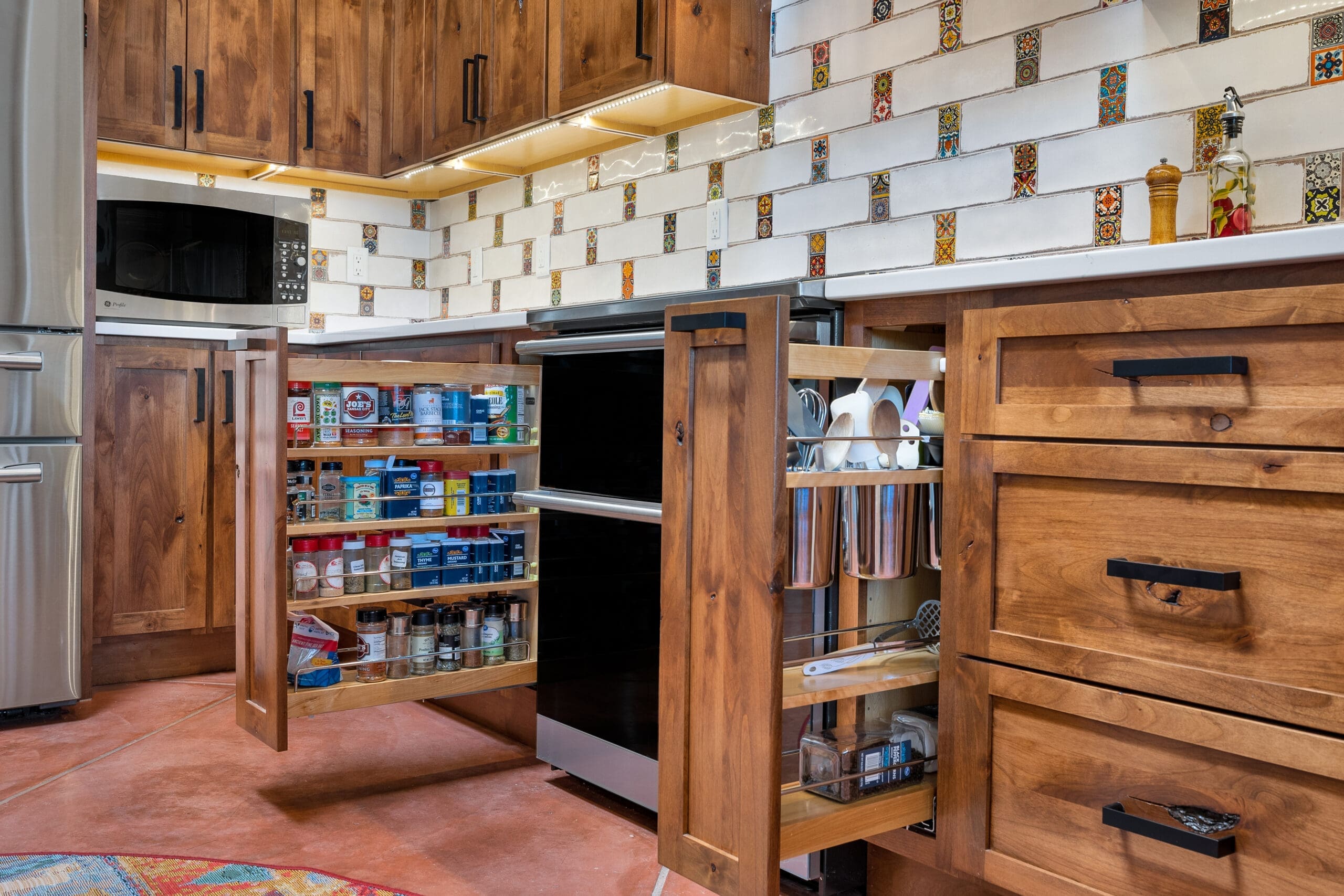 Special features include custom pantry doors, spice and utensil pull-outs, a lazy Susan cabinet, and trash pull-outs, all designed to maximize functionality and storage. This full kitchen remodel showcases the expertise in kitchen design, combining rustic and southwestern elements to create a beautiful and practical space.