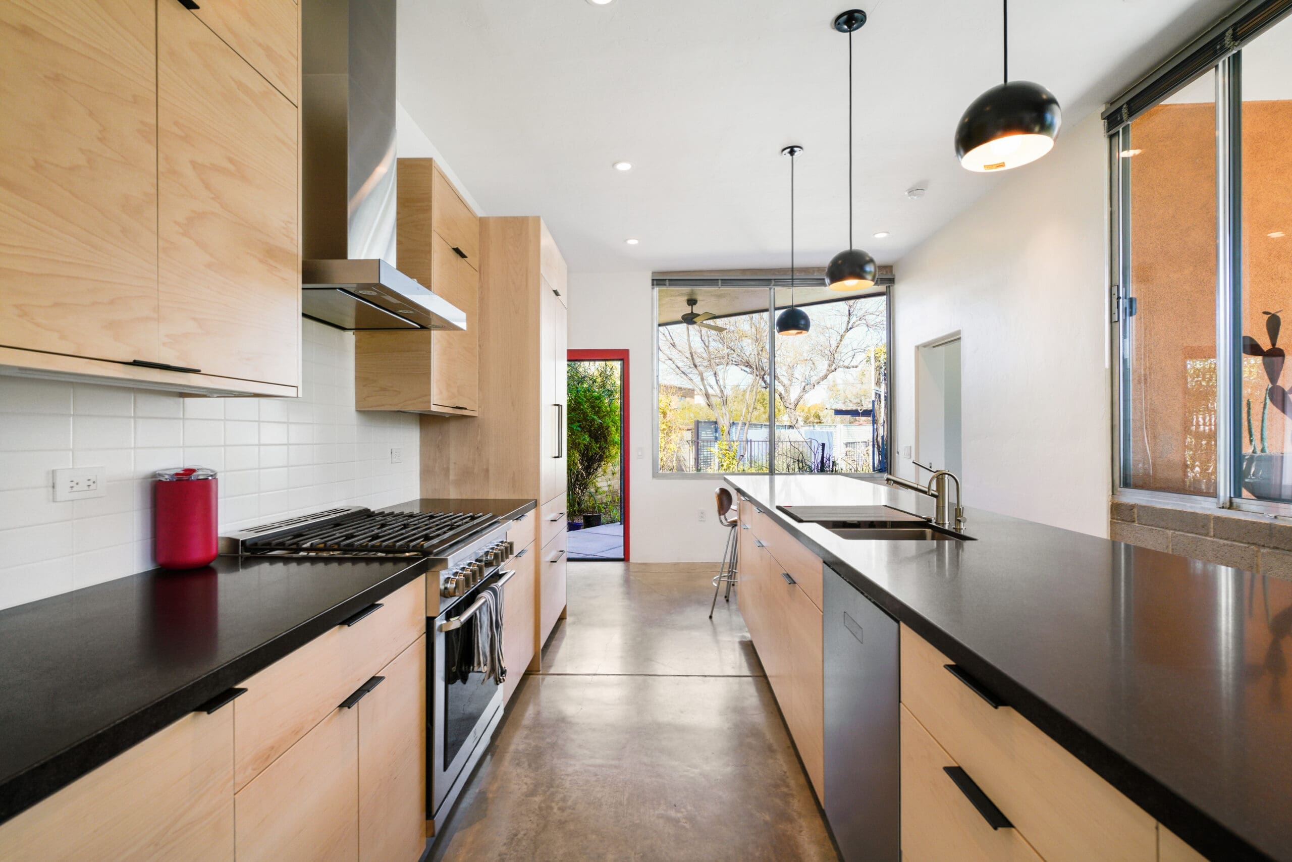 In this mid-century urban modern kitchen remodel in North Central Tucson, a stunning combination of natural stained maple and black countertops was used to create a sophisticated and timeless look. The remodel involved a full layout change, with two main divider walls removed to open up the space. Plumbing and electrical systems were relocated to accommodate the new design.