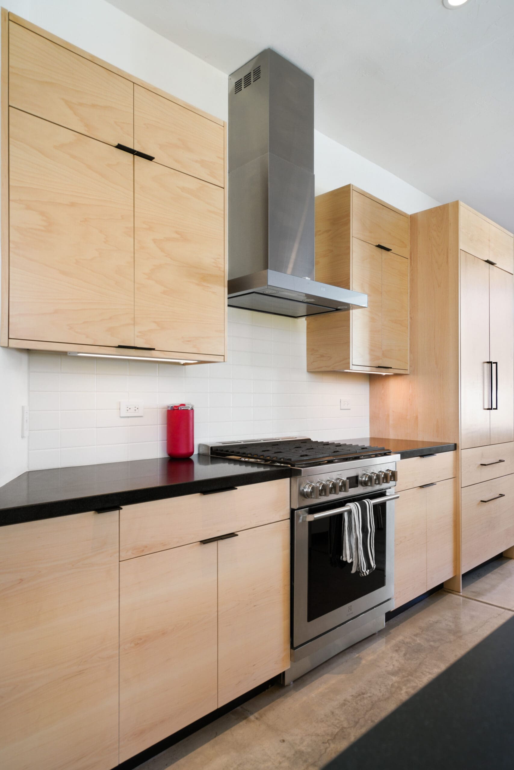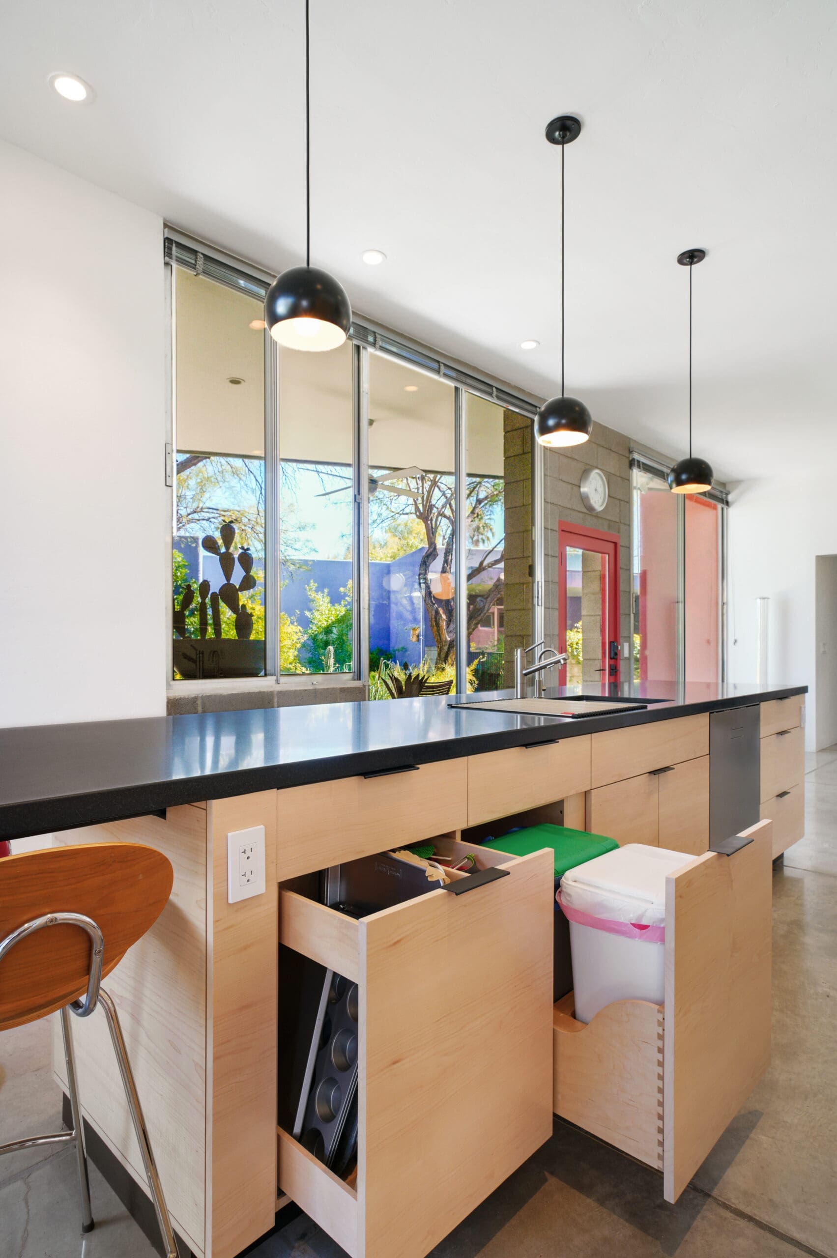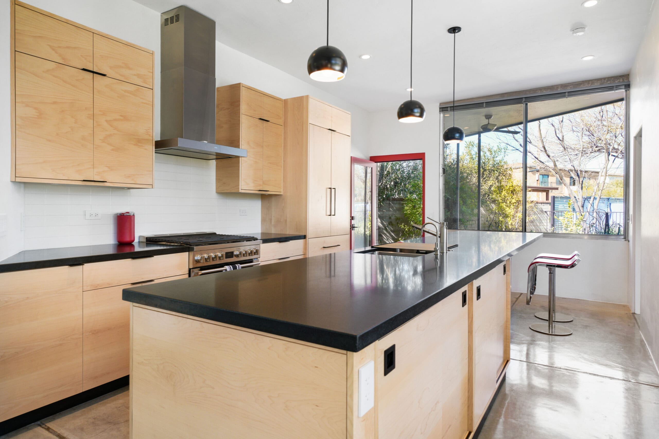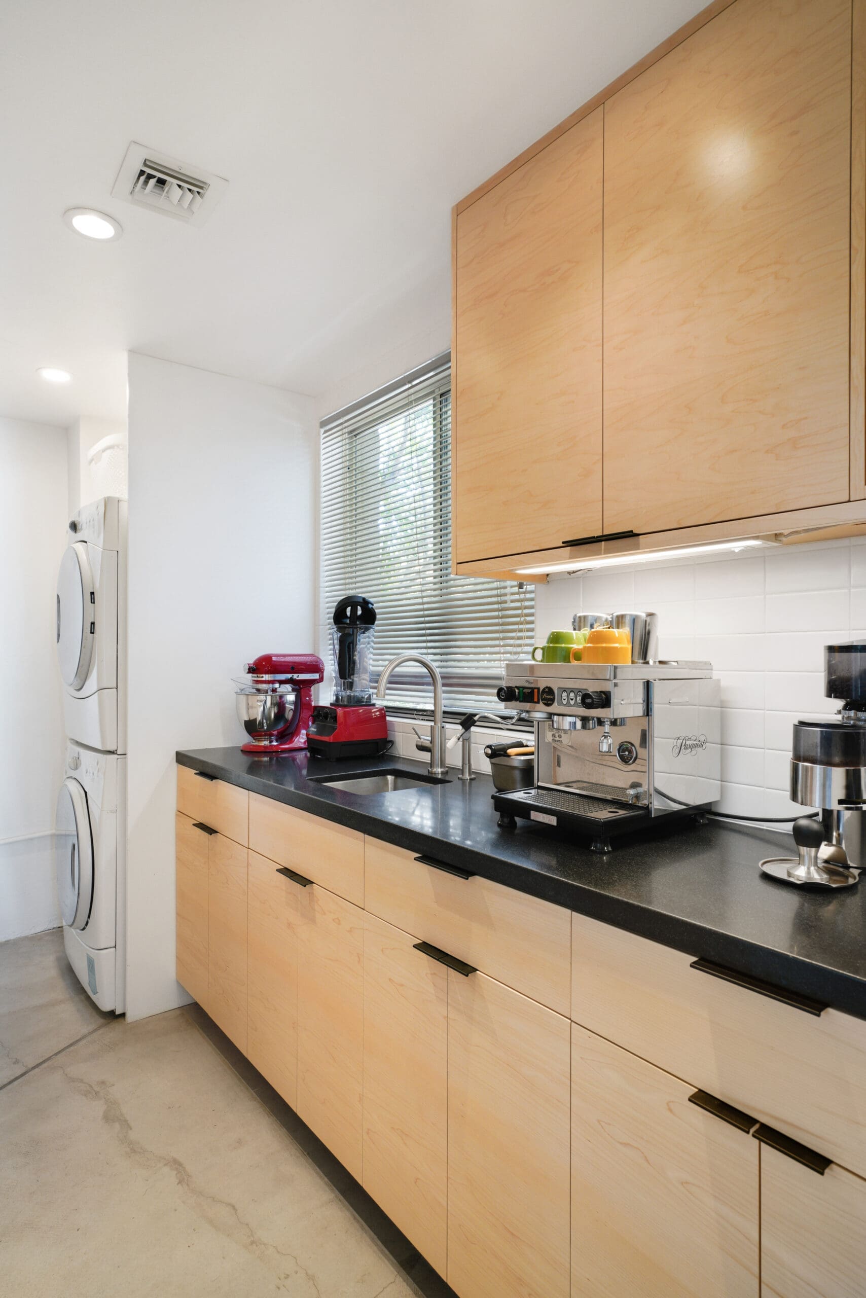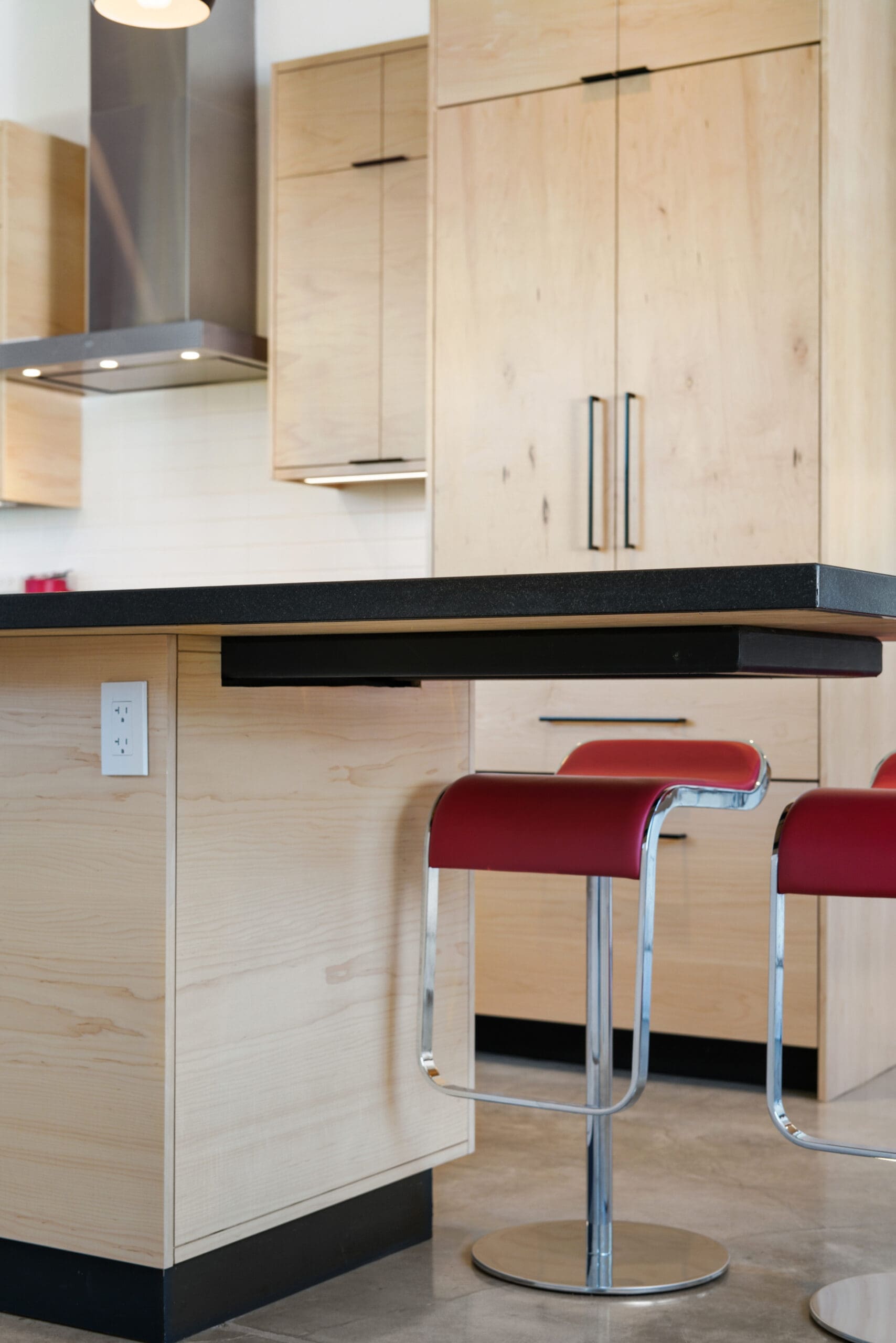 The kitchen features custom-built maple cabinets with all-plywood construction, crafted on-site, paired with a sleek black granite countertop and durable concrete floors. A standout feature is the custom combined spice and tray pull-out, along with a hidden support in the island that allows the countertop to be cantilevered 36 inches for additional seating.