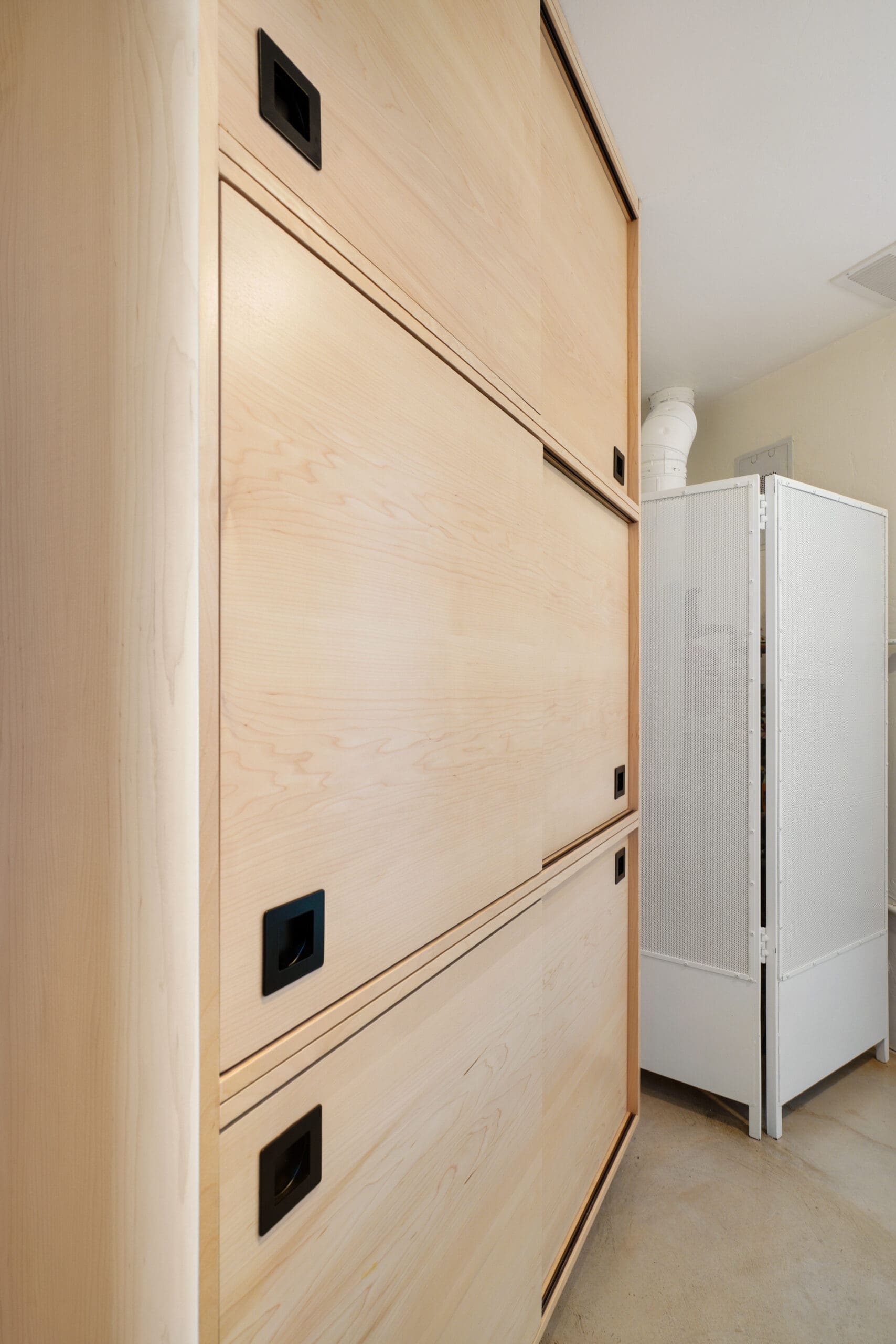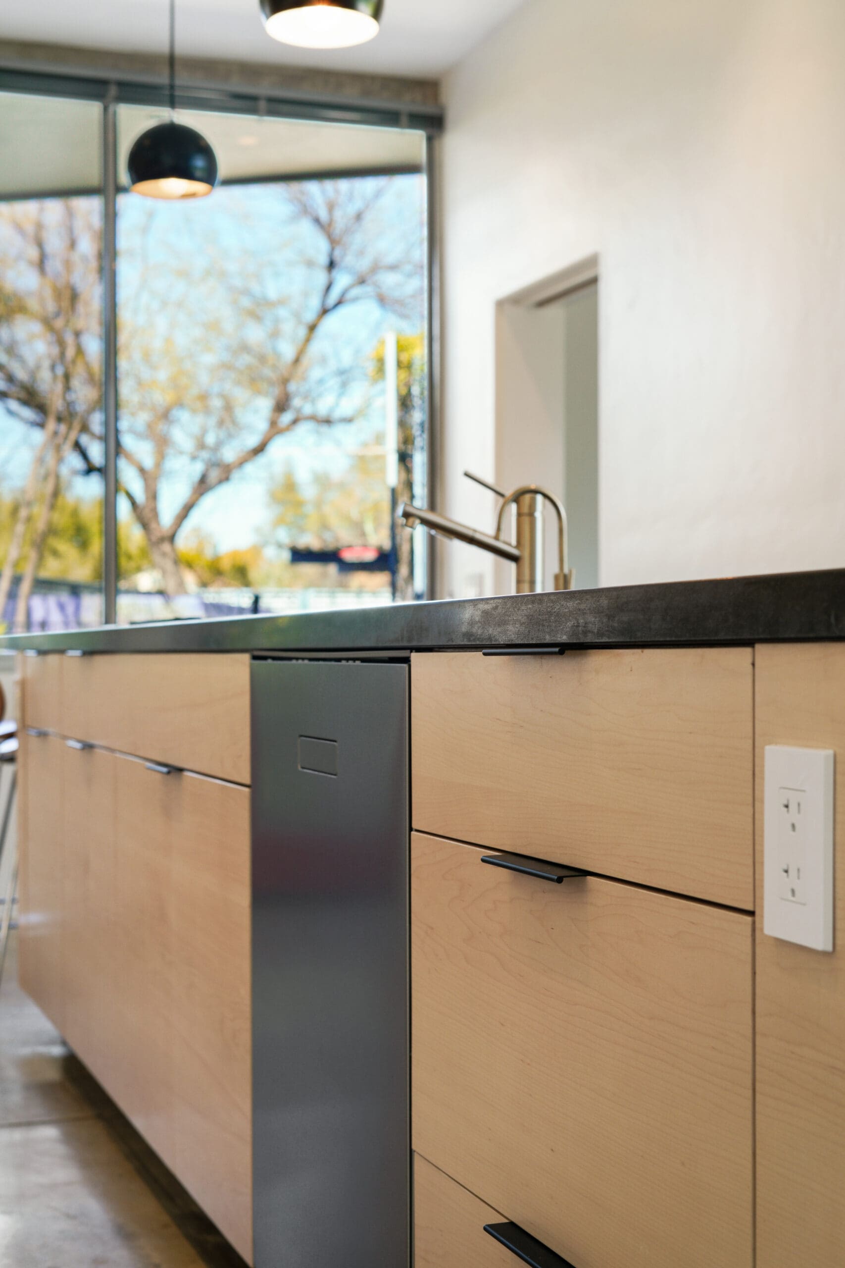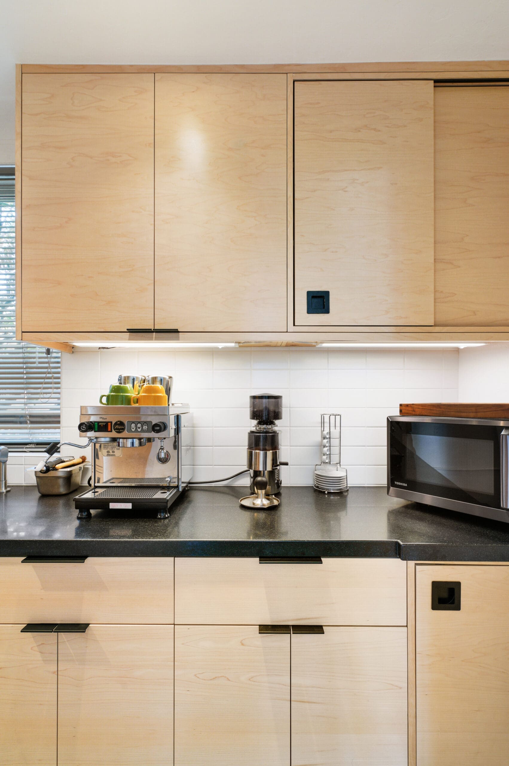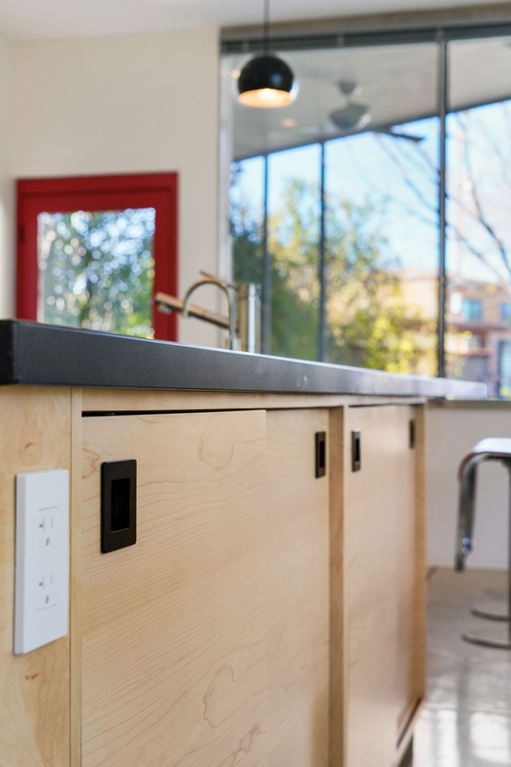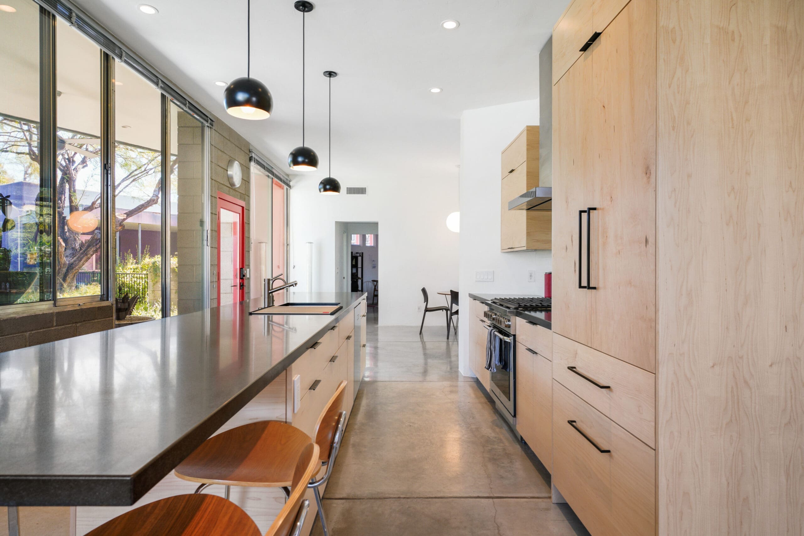 The kitchen features custom-built maple cabinets with all-plywood construction, crafted on-site, paired with a sleek black granite countertop and durable concrete floors. A standout feature is the custom combined spice and tray pull-out, along with a hidden support in the island that allows the countertop to be cantilevered 36 inches for additional seating.